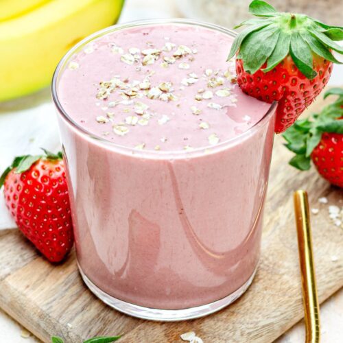 Mmm, een heerlijke aardbeiensmoothie met amandelmelk en havermout. Extra romig door de banaan die er ook in zit.