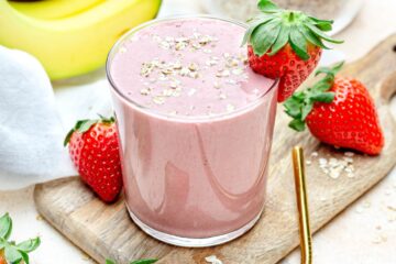 Mmm, een heerlijke aardbeiensmoothie met amandelmelk en havermout. Extra romig door de banaan die er ook in zit.