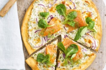 Pizza met een romige laag mascarpone, rode ui en gerookte zalm, een heerlijke variant van een all time classic pizza!