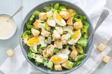 Het lekkerste recept voor de klassieke caesar salade, maak het zelf! Met zelfgemaakte dressing en krokante knoflook croutons. Optioneel met ansjovis, dit kun je ook weglaten.