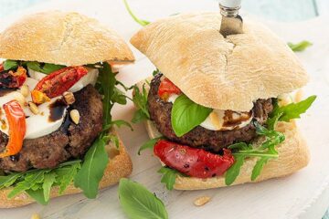 Lekkere kruidige zelfgemaakte Italiaanse burger op een ciabatta broodje met de Italiaanse ingrediënten mozzarella, gedroogde tomaatjes en verse basilicum.