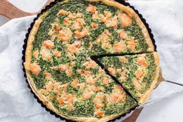 Lekkere quiche van bladerdeeg met een vulling van spinazie en zalm, een heerlijke combinatie!