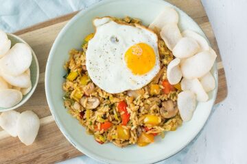 Lekker en makkelijk vegetarisch recept voor nasi goreng met gebakken groente en rijst geserveerd met een gebakken eitje. Nog lekkerder dan van de chinees!