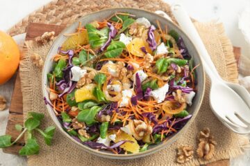 Recept voor een smakelijke wintersalade met ingrediënten uit het seizoen. Een heerlijke combinatie van rode kool, sinaasappel, walnoten en geitenkaas. De gekarameliseerde ui en honing-citroendressing maken het helemaal af.