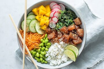 Maak nu zelf deze makkelijke en lekkere verse poké bowl met in soja gemarineerde tonijn, verse groenten en rijst! Echt een aanrader!