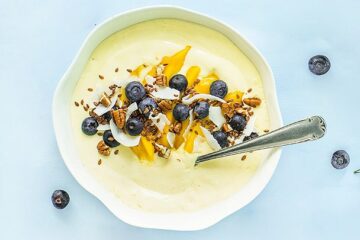 Begin de dag goed met deze tropische smoothie bowl op basis van mango en yoghurt en een lekkere topping van kokos