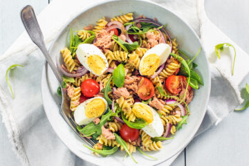 Makkelijke salade met pasta en tonijn uit blik met een Italiaanse twist van pesto en basilicum. Ideaal als lunch of lichte avondmaaltijd bij warm weer.