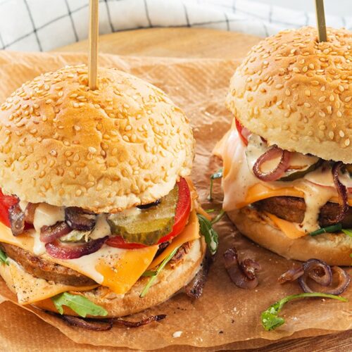 Geniet van een heerlijke klassieke cheeseburger! Ons recept bevat sappige hamburgers met gesmolten cheddar, plakjes tomaat en gebakken rode ui. Perfect voor een gezellige maaltijd of een zomerse barbecue.