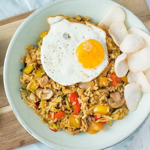 Lekker en makkelijk vegetarisch recept voor nasi goreng met gebakken groente en rijst geserveerd met een gebakken eitje. Nog lekkerder dan van de chinees!