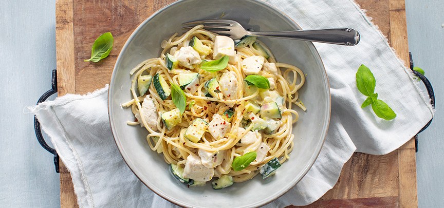 - Kook de spaghetti gaar. Snijd de kip in blokjes. Snipper de ui en knoflook. Fruit de ui en knoflook aan in een pan met een beetje olie of boter. Voeg de blokjes kip toe en bak rondom aan in ca 3 minuutjes. Snijd de courgette in blokjes en bak mee met de kip. Voeg de laatste paar minuutjes de champignons toe.